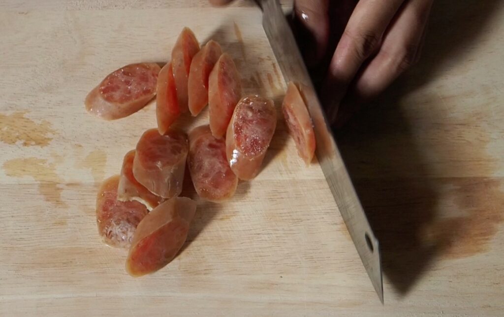 – นำกุนเชียงมาหั่นเป็นแนวยาวหรือวงกลมตามชอบ วิธีนี้เวลานำไปทอดจะโดนน้ำมันโดยรอบ กลิ่นจะหอมมากแต่เนื้อจะกระด้าง หากใครไม่ชอบวิธีนี้แนะนำให้ทอดกุนเชียงทั้งชิ้นยาวๆ ไปเลยค่ะ แล้วค่อยนำมาหั่นทีหลัง จะได้กุนเชียงเหลืองๆ หอมๆที่ด้านนอก และเนื้อนิ่มด้านใน