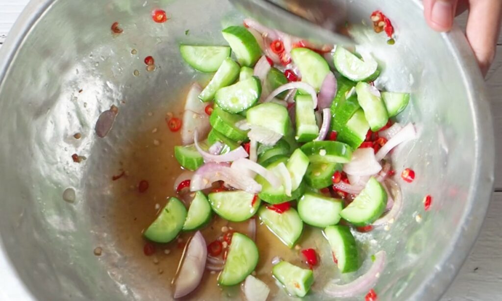 – จากนั้นเรามาเริ่มทำน้ำยำกันเลย ใส่น้ำปลา น้ำตาล น้ำมะนาวลงไป คนให้ละลายเข้ากันดี ใช้เวลานิดนึงค่ะ จากนั้นใส่พริก หอมแขก แตงกวา กุนเชียง และผักชีต้นหอม คลุกเคล้าให้เข้ากันค่ะ