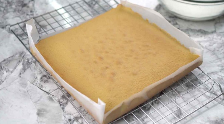 9. เตรียมถาด ขนาด 10 x 10 รองด้วย กระดาษไขรองอบ เทส่วนผสมเนื้อเค้กลงไป ปาดเนื้อเค้กให้ทั่วถาด นำ