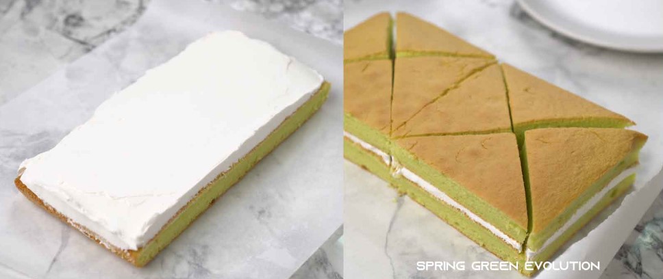 12. จากนั้น นำครีมมาปาดลงบนเนื้อเค้ก ส่วนแรก จนทั่ว นำเนื้อเค้กส่วนที่ 2 ที่ตัดไว้ มาวางประกบคู่กัน จากนั้น