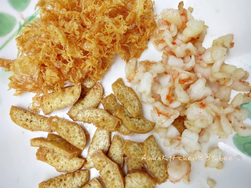 • กุ้งสด 300 กรัม (หั่นชิ้นเล็ก ๆ รวนพอสุก ตักขึ้นพักไว้)