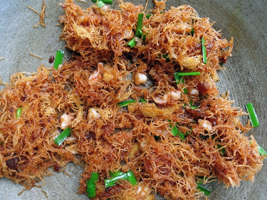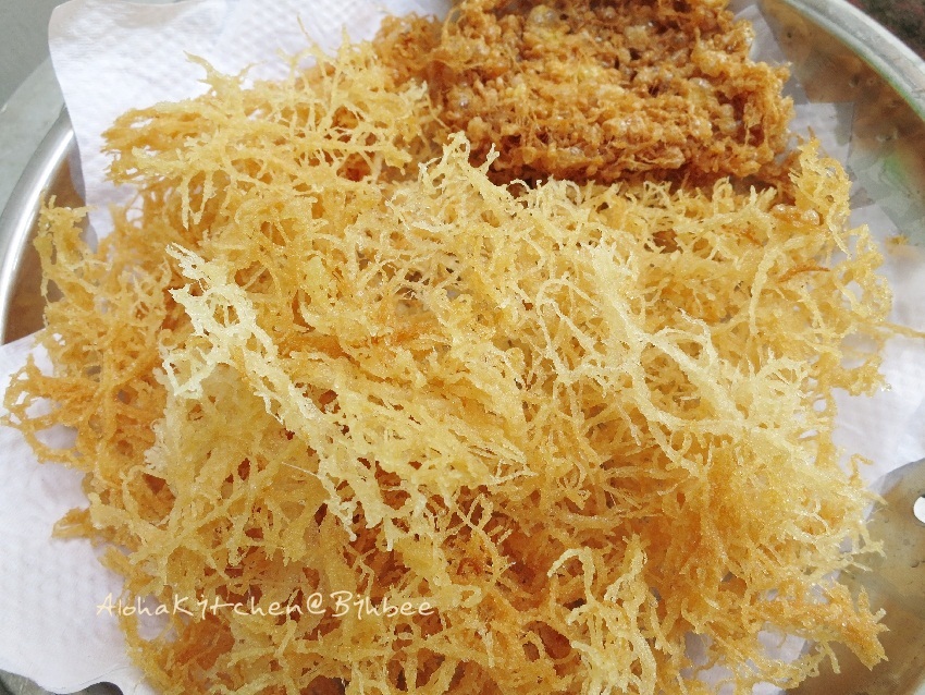 – ตั้งกระทะใส่น้ำมัน พอน้ำมันร้อนได้ที่ค่อย ๆ โรยไข่ลงไป ไข่จะเกาะตัวกันเป็นแพ พอไข่เหลืองกรอบดีแล้ว ตักขึ้น พักไว้