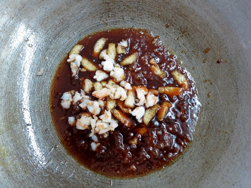 – ทอดเต้าหู้ รวนกุ้งแล้ว เทน้ำมันออก ให้เหลือติดกระทะประมาณ 1 ช้อนโต๊ะ