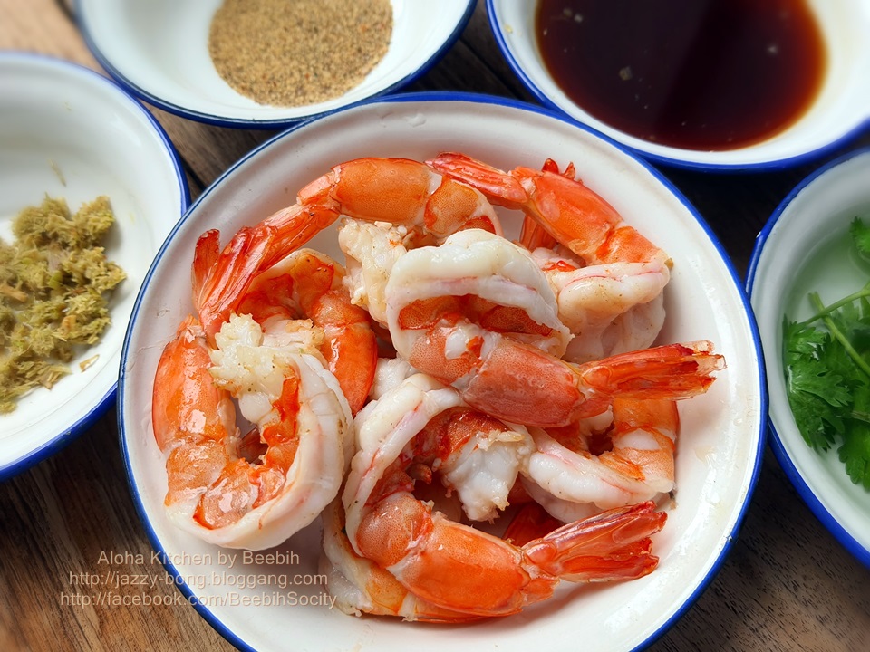 ล้างกุ้งให้สะอาด ปอกเปลือก ผ่าหลัง ดึงเส้นดำออก ใส่ตะกร้าให้สะเด็ดน้ำ เอากุ้งลงทอดในน้ำมันแค่ให้สะดุ้งประมาณ 1 นาที สุกแค่ 70% ตักขึ้น พักไว้