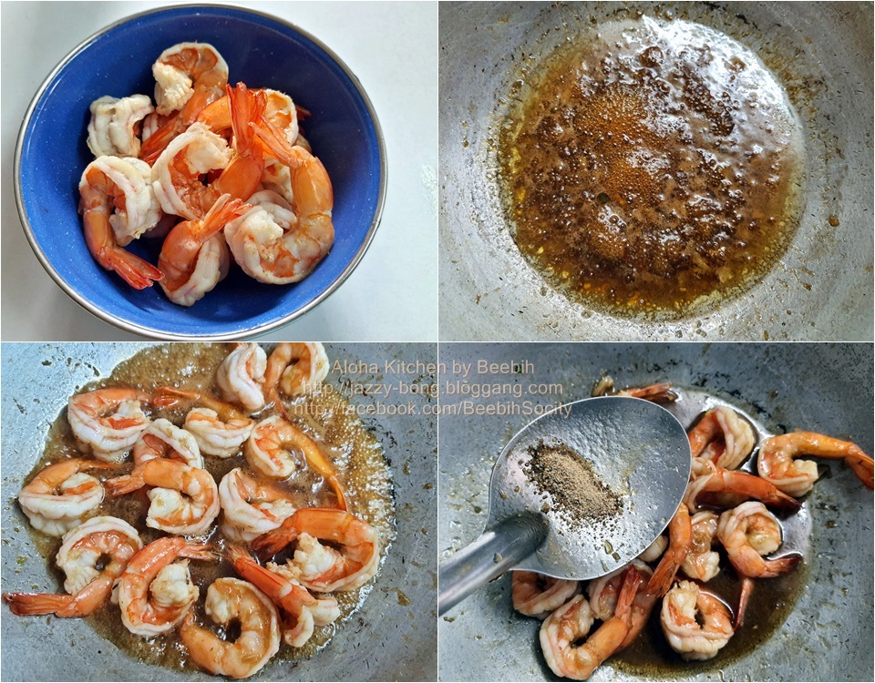 2. เทน้ำมันเจียวกระเทียมออก เหลือติดกระทะ 1 ชต. ปรุงรสด้วยซอสฝาเขียว น้ำมันหอย, น้ำปลา, น้ำตาล เติมน้ำเปล่า ผัดเครื่องปรุงให้เข้ากัน ชิมรสตามชอบ (รสชาติขึ้นอยู่กับปริมาณกุ้งมากหรือน้อย) ชอบรสชาติแบบใดก็ปรุงเพิ่มเข้าไป
