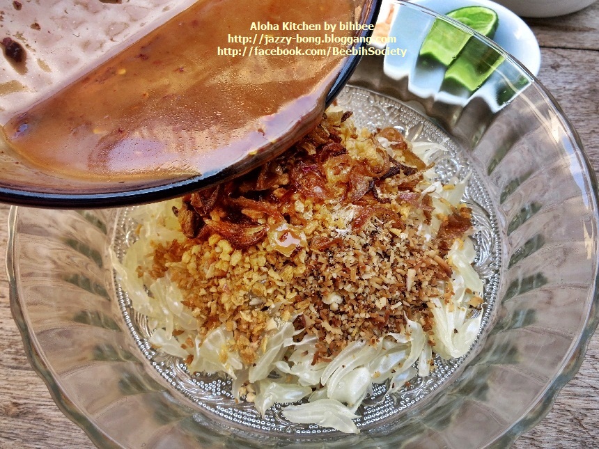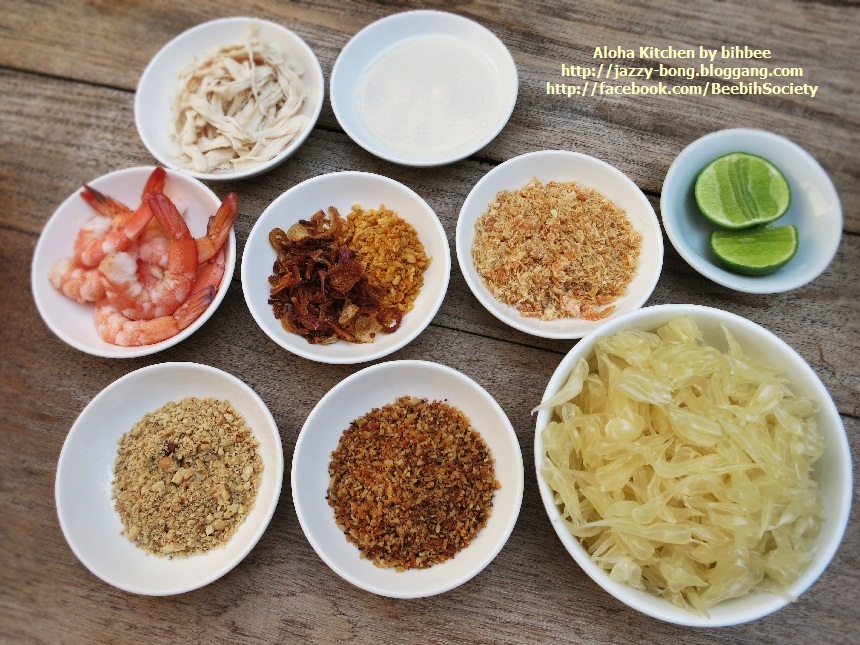 – ชามผสมอีกใบ ฉีกเนื้อส้มโอเป็นเส้น ๆ ใส่ในชาม ใส่ถั่วลิสงคั่วบด เคยคั่ว หอมเจียว กระเทียมเจียว มะพร้าวคั่วบด พริกขี้หนูคั่วบด และน้ำมะนาว ใส่เนื้อไก่ฉีกเส้น ใส่กุ้งต้มทั้งตัวหรือหั่น