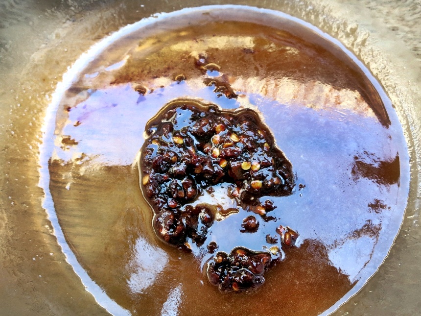 – ชามผสม ใส่น้ำตาลปีบ น้ำเปล่า น้ำปลา น้ำมะขามเปียก น้ำพริกเผา ตั้งไฟให้ละลาย