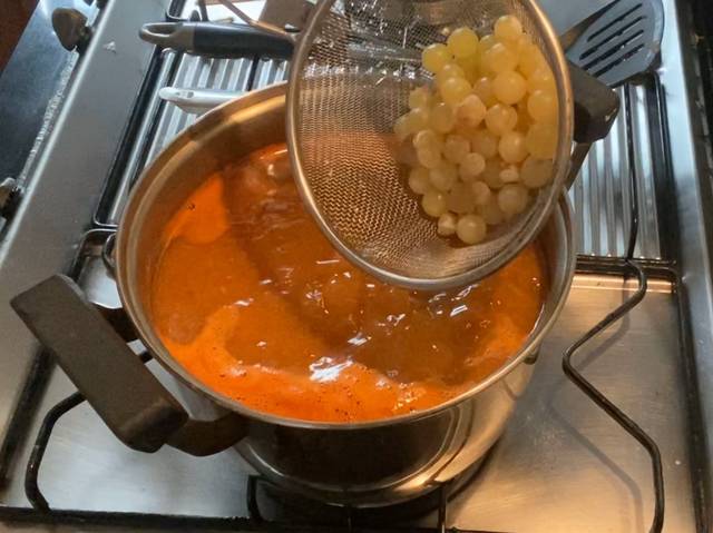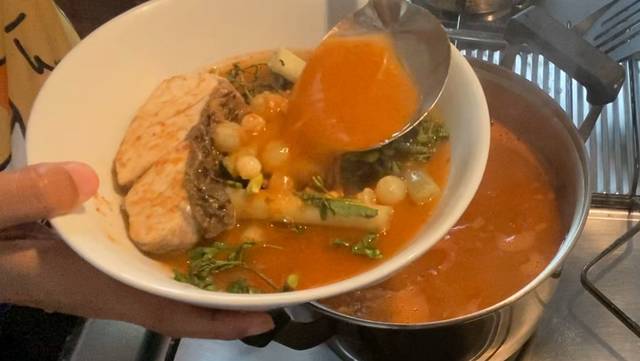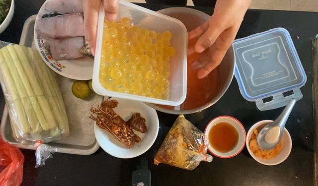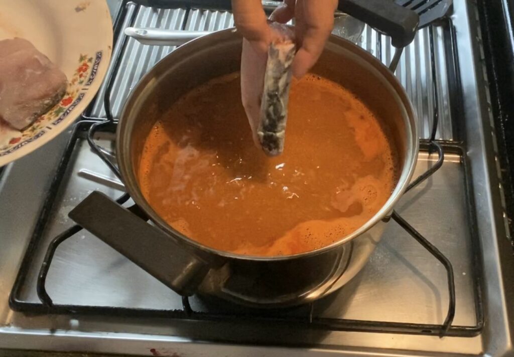 – ตามด้วยเนื้อปลากะพง และไข่ปลาริวกิวที่ต้มไว้ ต้มต่อประมาณ 10 นาทีหรือจนกว่าเนื้อปลาสุก