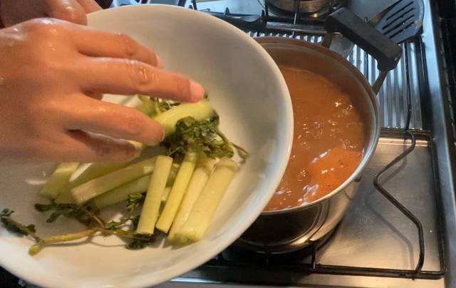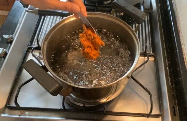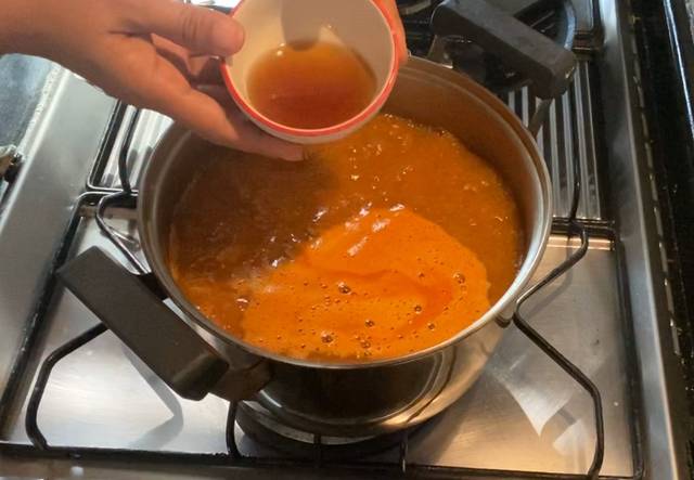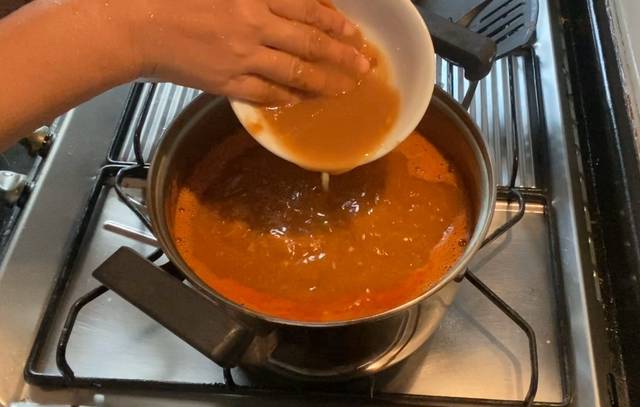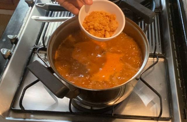 – นำเครื่องแกงส้มที่โขลกใส่ลงไปในน้ำต้มเดือด