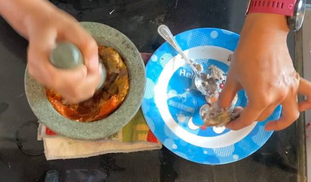 – จากนั้นมาทำเครื่องแกงส้มกันคะ โดยน้ำพริกแกงส้มตำกับเนื้อปลาทูแกะกางออก ตำจนเป็นเนื้อเดียวกัน