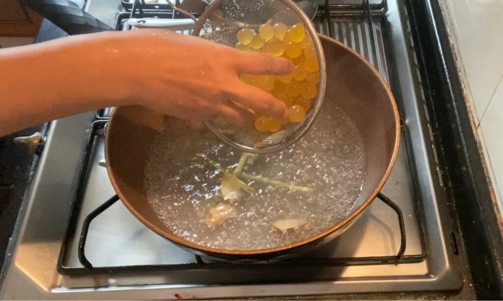 – ตั้งน้ำร้อนใส่เกลือ ตะไคร้ ข่า แล้วนำไข่ปลาริวกิวลงไปต้ม ให้คนตลอดเวลานะคะ ระวังไข่ปลาแตกนะคะ เพราะจะทำให้น้ำขุ่นและคาวคะ ต้มประมาณ 15 นาที