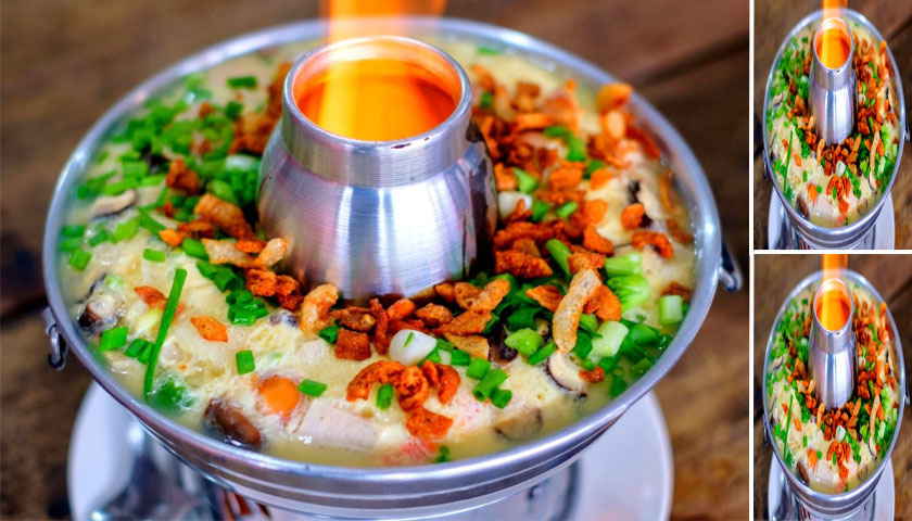 – จากนั้น เทลงในหม้อไฟ ปิดฝา แล้วจุดไฟ โดยใช้แอลกอฮอลล์ชนิดแข็ง 3 ก้อน ให้ได้ไฟแรง ตุ๋นไข่ ใช้เวลาประมาณ 10 นาที