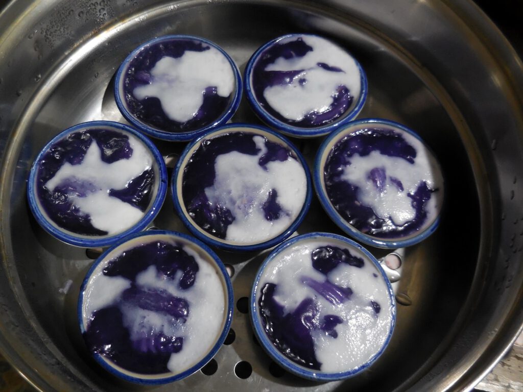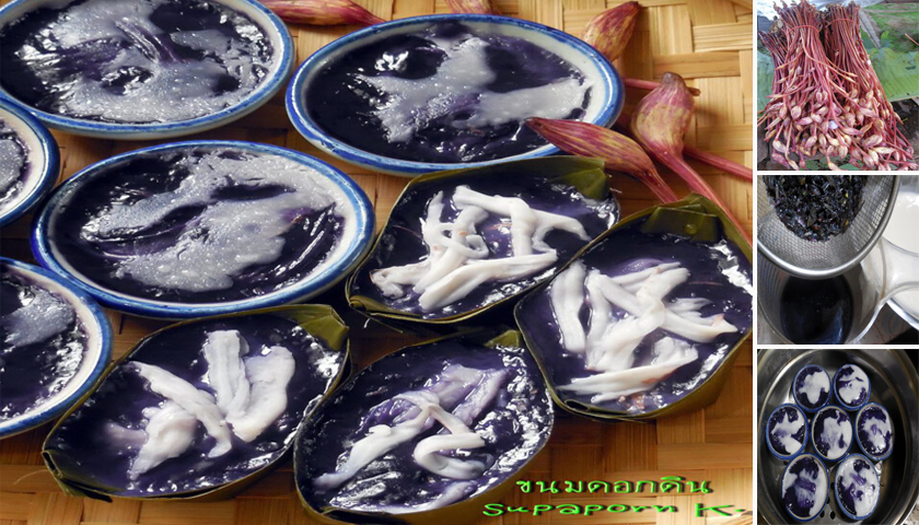 คนส่วนมากอาจจะไม่เคยได้เห็นหรือได้ยินชื่อ “ดอกดิน” หรือดอกข้าวก่ำ จะออกดอกปีละครั้งในช่วงหน้าฝนค่ะนอกจากนำมานึ่งข้าวเหนียวให้มีสีสวยงามแล้ว คนสมัยก่อน ก็ยังนำมาทำเป็นขนมได้ด้วยค่ะ บางสูตรก็จะโขลกดอกและก้านดอกส่วนที่อ่อนๆ ให้ละเอียด แล้วนำมาผสมกับแป้งเลย หรือจะคั้นเฉพาะน้ำมาใส่ก็ได้ค่ะ ขนมจะมีรสสัมผัสคล้าย ๆ ขนมเปียกปูน แต่จะนิ่มกว่าเพราะไม่ได้ใส่น้ำปูนใส มีสีม่วงเข้มและเงา มีกลิ่นของดอกดินหอมอ่อนๆค่ะ
