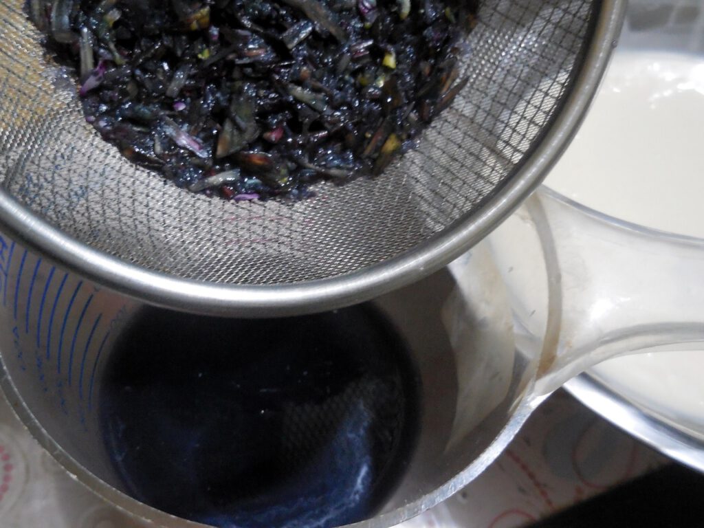 3. ใส่น้ำคั้นดอกดินลงไป คนให้เข้ากัน นำไปกรองด้วยกระชอนถี่ๆ พักไว้ 20 นาที