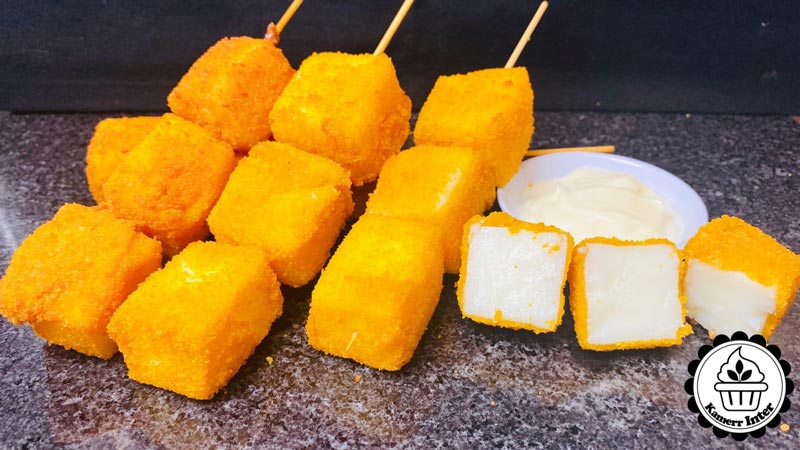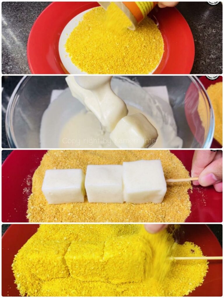 – วันนี้ได้เกล็ดขนมปังสีทองมาค่ะ นำนมสดที่เสียบไม้แล้วมาจุ่มลงในแป้งเปียกและคลุกด้วยเกล็ดขนมปัง