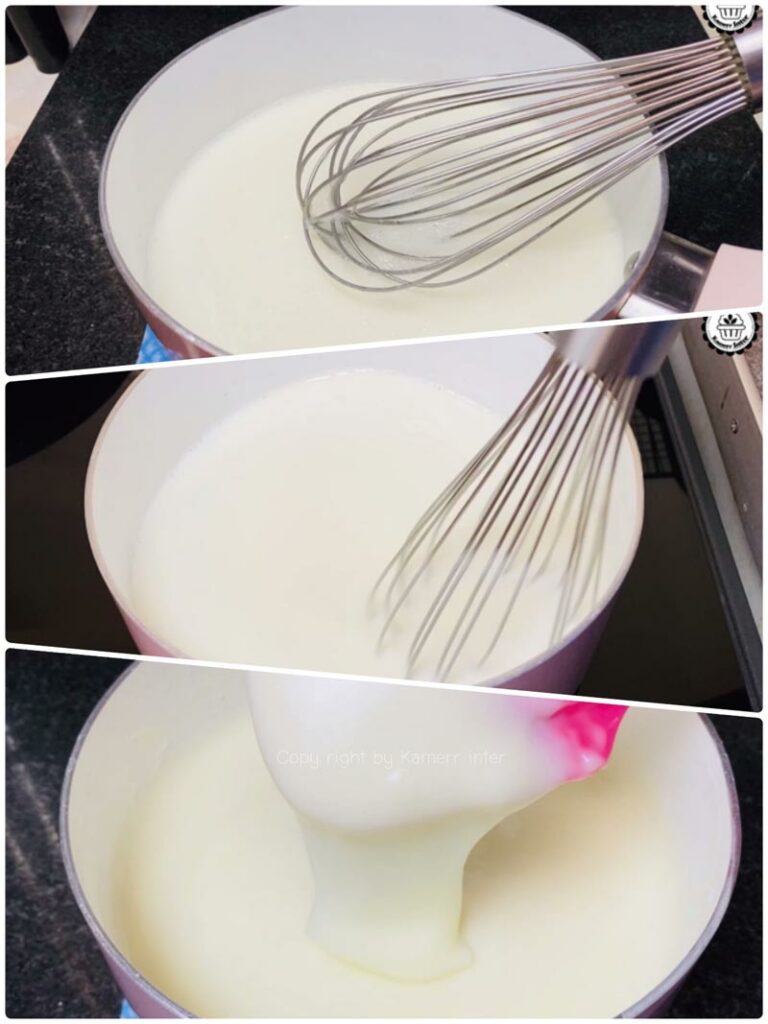 – เทนมสดลงหม้อ เติมน้ำตาลทราย เกลือ และแป้ง คนส่วนผสมทุกอย่างให้เข้ากันดี