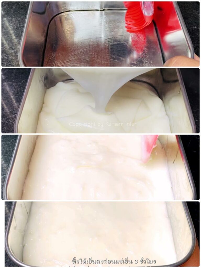– หลังจากที่ส่วนผสมเหนียวได้ที่แล้ว ยกลงจากเตา เทใส่พิมพ์ที่แปรงด้วยน้ำมันบาง ๆ พักทิ้งไว้ให้เย็นก่อนจะนำแช่ตู้เย็นช่องธรรมดา 3 ชั่วโมง