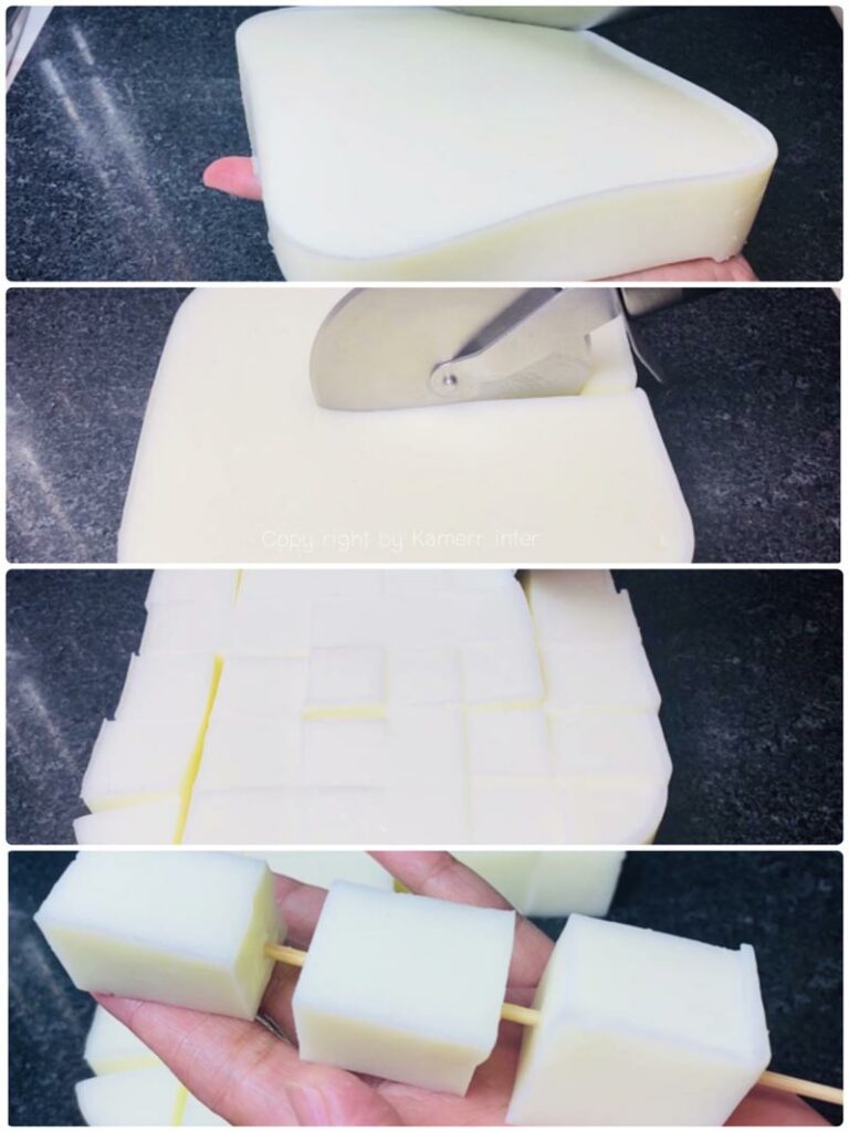 – หลังจาก 3 ชั่วโมงผ่านไปและแป้งเซตตัวให้นำมาตัดแบ่งเอาขนาดตามต้องการ วันนี้นำไปเสียบเป็นลูกชิ้นนมสดทอดค่ะ