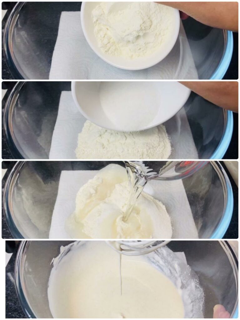 – ทำแป้งเปียกสำหรับชุบนมสดทอด เริ่มจากเทแป้งลงในชาม ตามด้วยน้ำตาลทรายและน้ำ คนให้ทุกอย่างเข้ากันดี