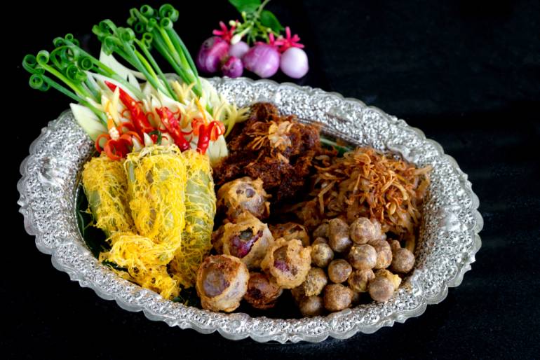 4.เครื่องเคียงข้าวแช่ ประกอบด้วย ลูกกะปิ หอมแดงยัดไส้ พริกหยวกสอดไส้ หมูฝอย หรือ เนื้อฝอย ไชโป๊ผัดไข่