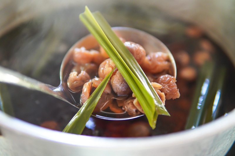 2. ต้มน้ำให้เดือด ใส่ลำไยและใบเตยลงไปต้มประมาณ 15 นาที หรือจนสีเข้มขึ้น