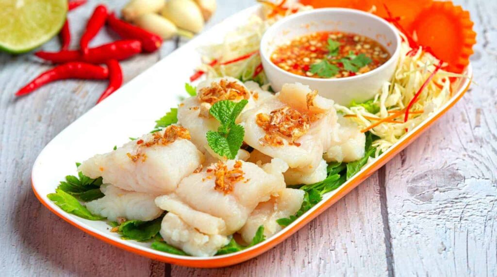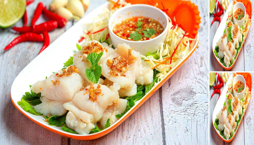 – ระหว่างรอให้จัดจาน โดยวางผักชีรองเอาไว้ ตามด้วยกะหล่ำปลีและแครอทอยู่ข้าง ๆ พอเนื้อปลาสุกแล้ว ให้ตักขึ้นวางใส่จาน โรยหน้าด้วยกระเทียมเจียว