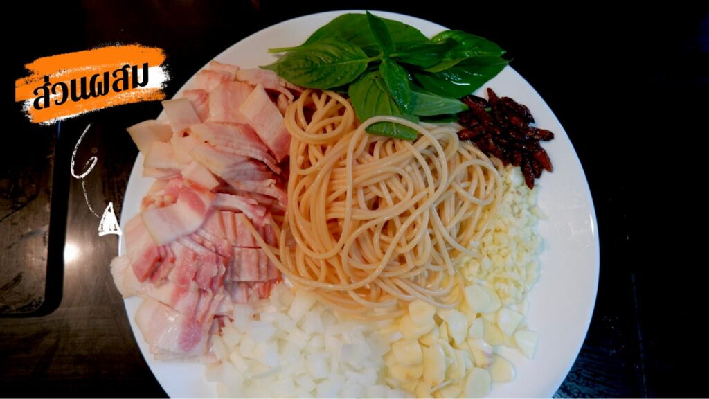 เส้นสปาเก็ตตี้เหนียวนุ่ม กับเบคอนรสกลมกล่อม คลุกเคล้ารสเผ็ดร้อนแบบไทยๆ