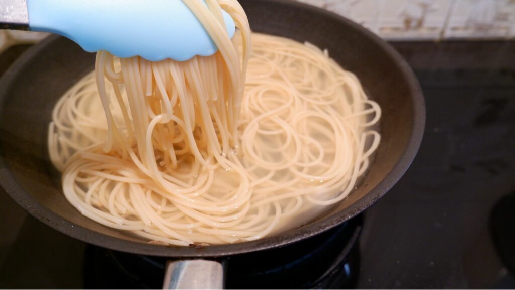 1. ต้มเส้น ตั้งกระทะใส่น้ำประมาณครึ่งนึง ใส่เกลือเล็กน้อย รอจนน้ำเดือด ใส่เส้นสปาเกตตี้ลงไปต้ม ประมาณ 10