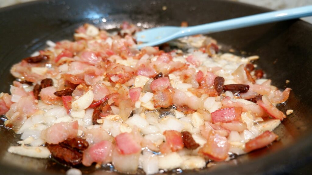 4. ตั้งกระทะบนเตาใช้ไฟกลาง ใส่เบคอนลงไป ทอดจนเบคอนออกสีเหลือง