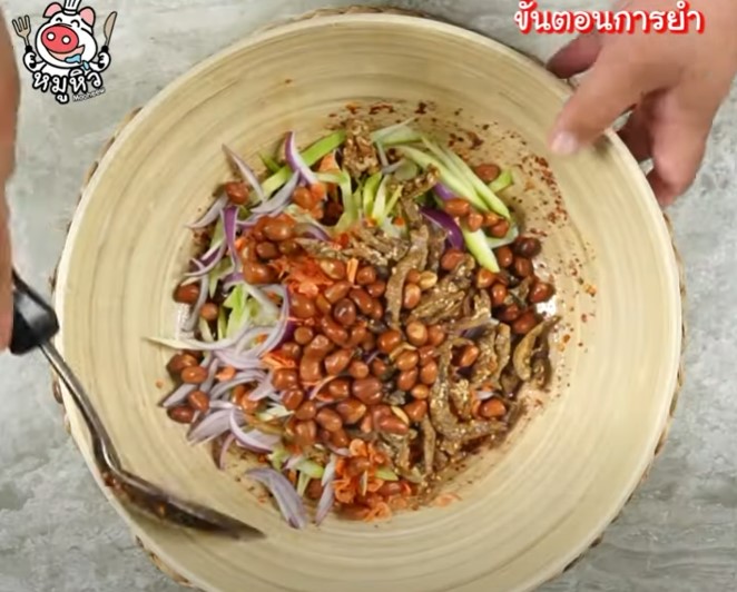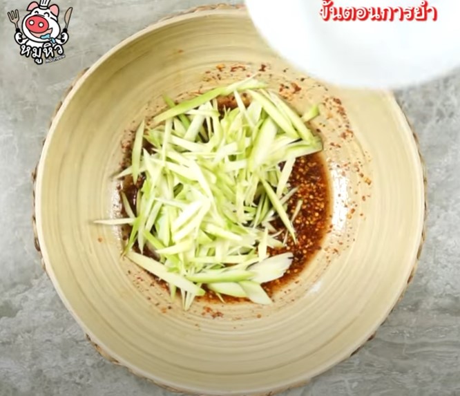 4. ใส่มะม่วงขูดเส้น หอมแขก กุ้งแห้ง ปลากรอบ ถั่วลิสง คลุกเคล้าทุกอย่างให้เข้ากัน จากนั้น จัดเสิร์ฟใส่จาน