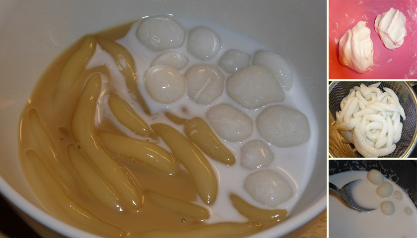 2. ตั้งน้ำให้เดือดจัด เทแป้งลงไป ใช้ไม้พายคนเร็วๆ แป้งจะสุกใสขึ้น ถ้าแห้งไปเติมน้ำเดือดได้ หรือแฉะไปโรยแป้งข้าวเหนียว