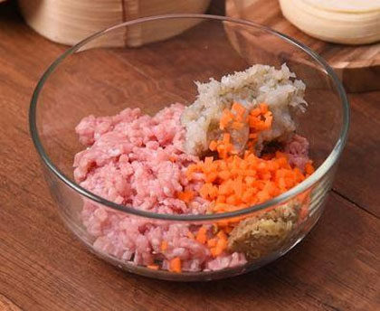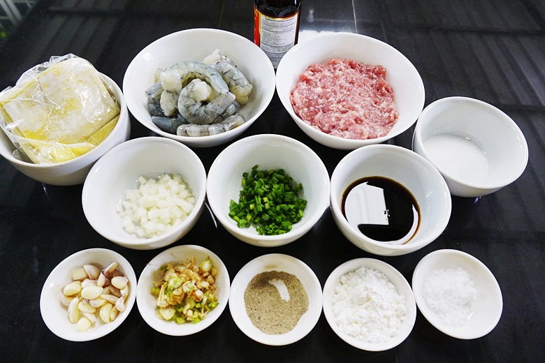 1 นำเนื้อหมูบด กุ้ง เนื้อปูและมันหมู ใครชอบเห็ดหอมก็สามารถใส่รวมไปได้ ใส่น้ำมันงา กระเทียม พริกไทย