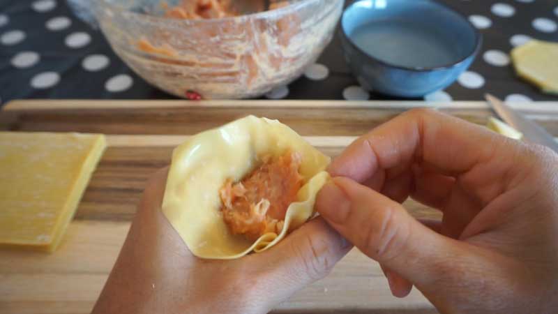 3 ครบเวลาแล้วให้เรานำออกมาจากตู้เย็น แล้วนำมาห่อด้วยแผ่นเกี๊ยวที่เตรียมไว้ อย่าใส่มากหรือน้อยจนเกินไป