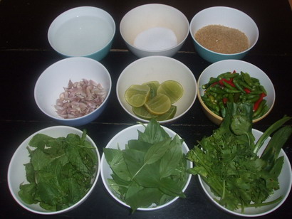 1. โขลกรากผักชี กระเทียม พริกขี้หนู ใบสะระแหน่และใบโหระพาให้ละเอียด