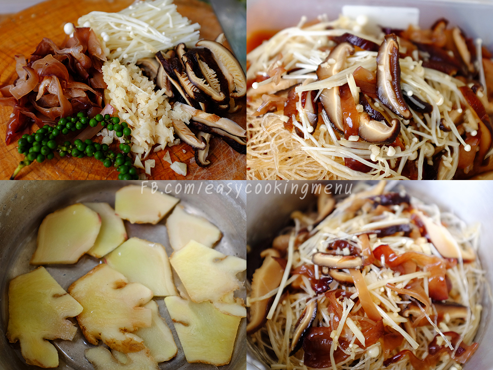1.เห็ดหอมแช่น้ำให้นิ่มหั่นเป็นเส้น 3 ดอก