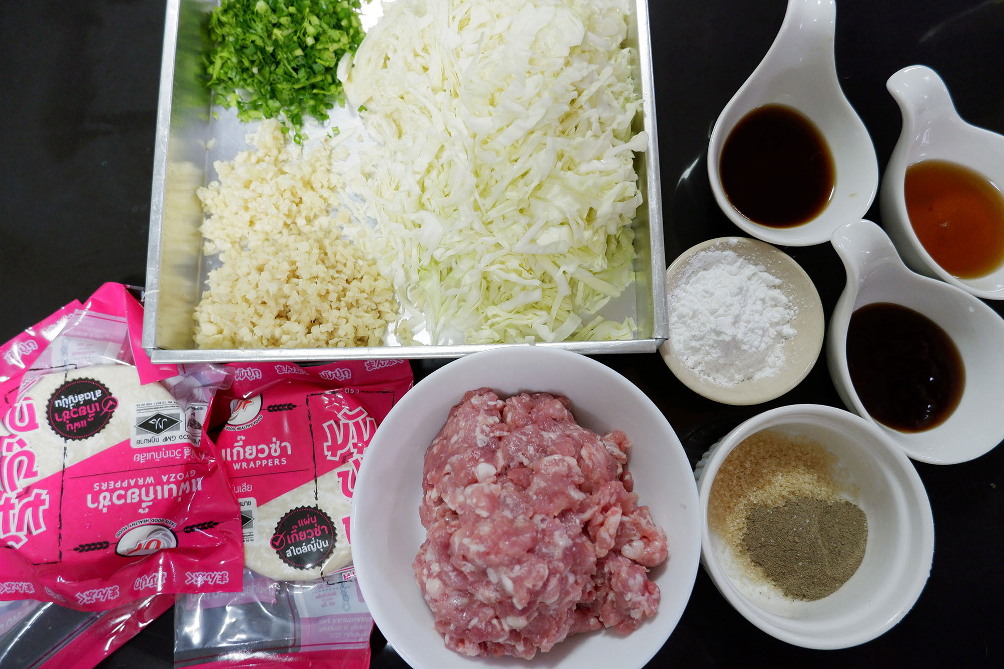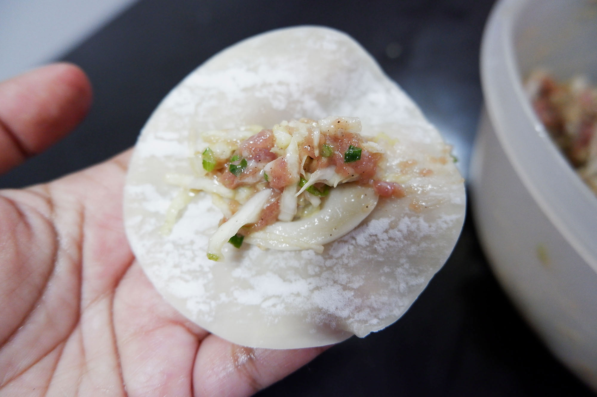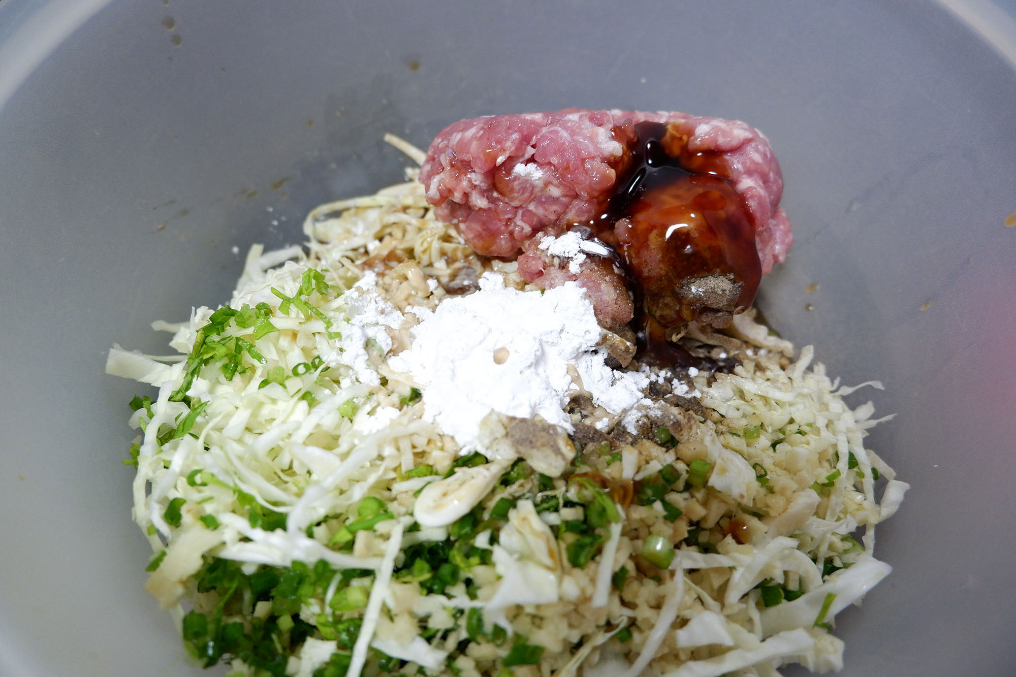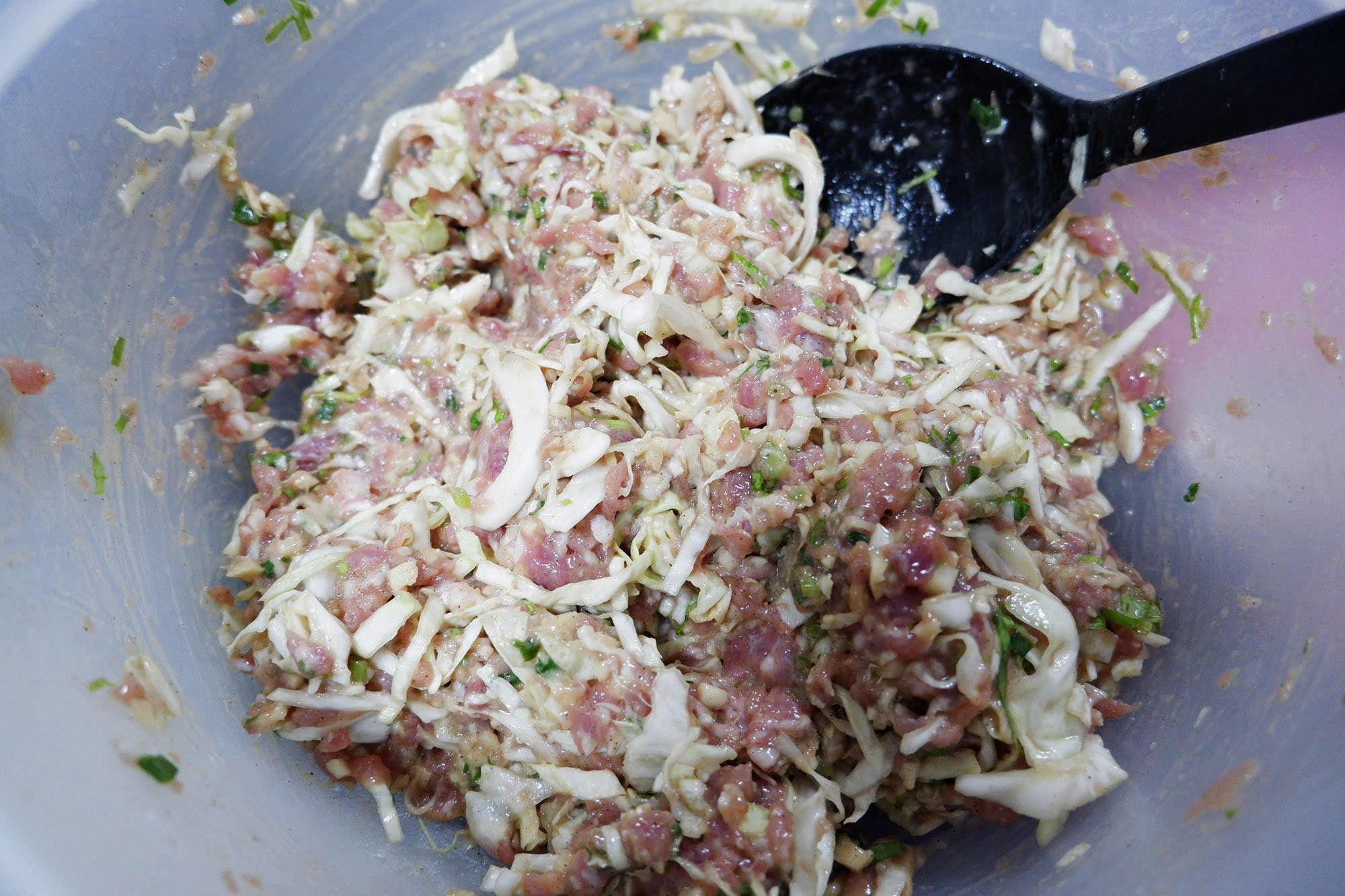 – นำส่วนผสมตั้งแต่ข้อ 2-12 มาผสมรวมกัน ใช้ช้อนบี้หมูไปเรื่อยๆ จนกว่าจะรวมตัวกับกะหล่ำปลี พอน้ำกะหล่ำปลีออกมาผสมกับแป้งมัน ตัวไส้จะเหนียวขึ้นค่ะ