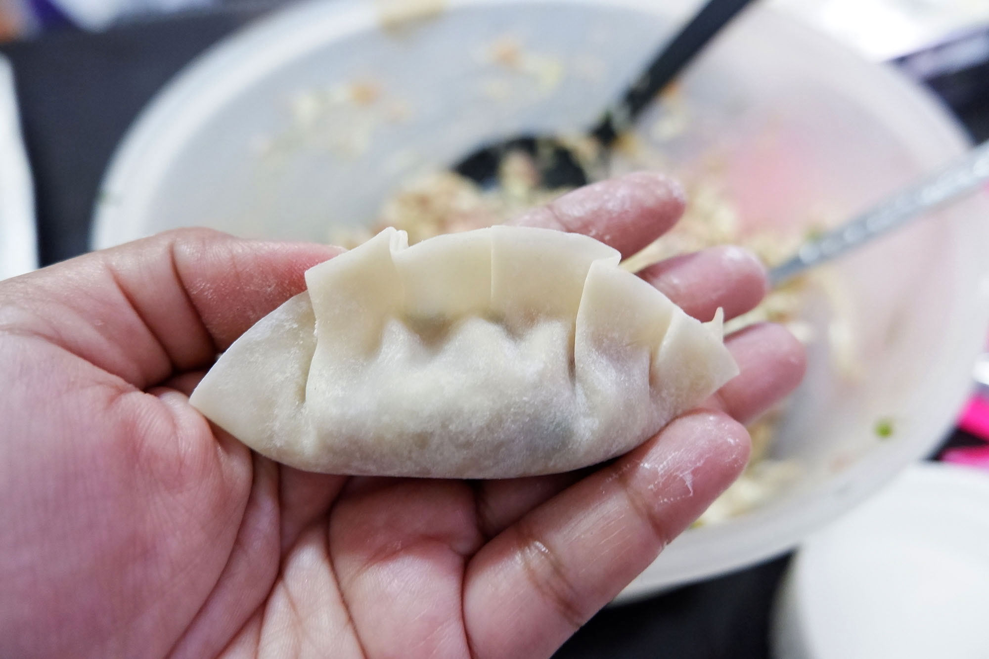 – ใส่ไส้ลงไปตรงกลาง จากนั้นทาน้ำตรงขอบแผ่นเกี๊ยวประกบเข้าหากัน แล้วก็เริ่มจีบได้เลยค่ะ ถ้ายังไม่ทอดให้ใช้ผ้าขาวบางชุบน้ำหมาดๆ คลุมไว้ก่อนนะคะ