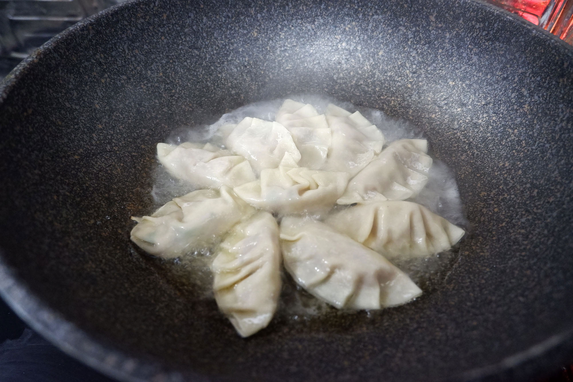 – จากนั้นเทน้ำตามลงไปให้ได้ประมาณครึ่งตัวเกี๊ยว ปิดฝา แล้วเร่งไฟให้แรงสุด