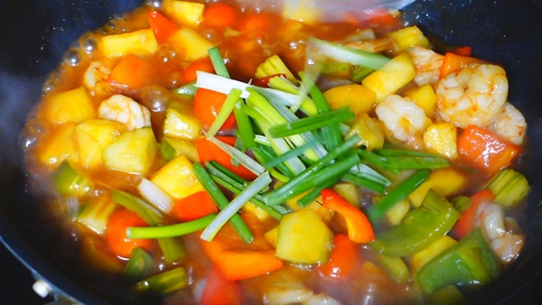 2. ใส่สับปะรด แตงกวา หอมใหญ่ พริกฝรั่ง ต้นหอม และมะเขือเทศลงไปผัดจนสุก