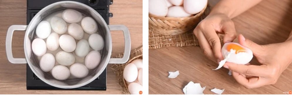 1.นำไข่เป็ดใส่ลงไปในหม้อ เทน้ำเปล่าลงไปประมาณ ⅔ ของไข่เป็ดจนท่วม ใส่เกลือ และน้ำส้มสายชู (การใส่เกลือและน้ำส้มสายชู จะช่วยให้ไข่เป็ดไม่แตกและแกะง่าย) จากนั้นนำขึ้นตั้งไฟปานกลาง และต้มไข่ใช้เวลา 7 นาที พอครบ 7 นาทีแล้ว ตักไข่เป็ดใส่ในน้ำเย็น และปอกเปลือกไว้