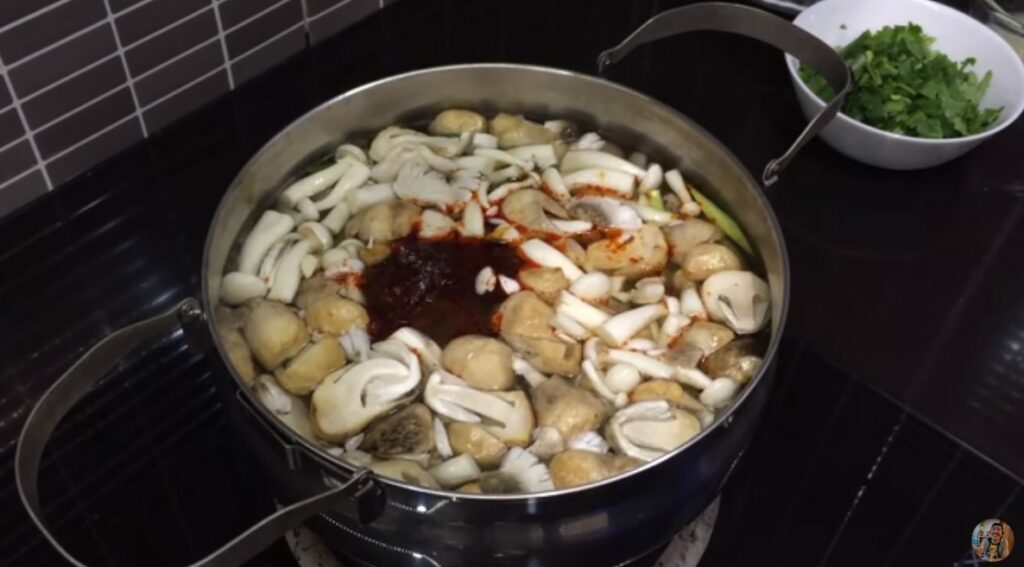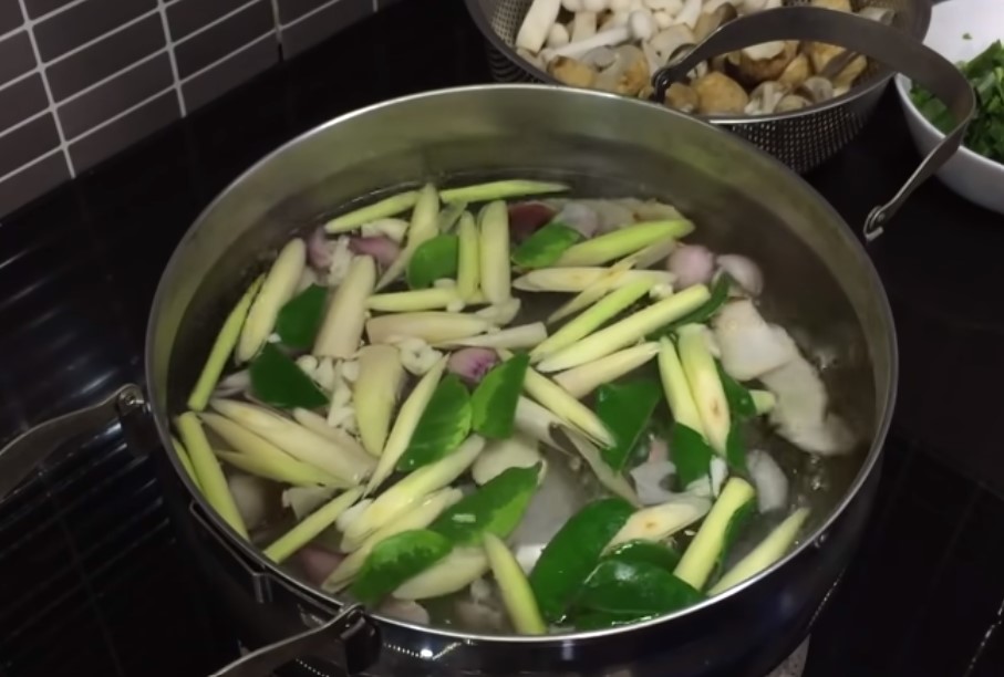 5.จากนั้นใส่เครื่องต้มยำ หอมแดง ขิง ข่า ตะไคร้ ใบมะกรูด รากผักชีลงไป รอให้เดือดสักพัก ใส่เห็ดฟางลงไป เร่งไฟแรงให้เห็ดสุก