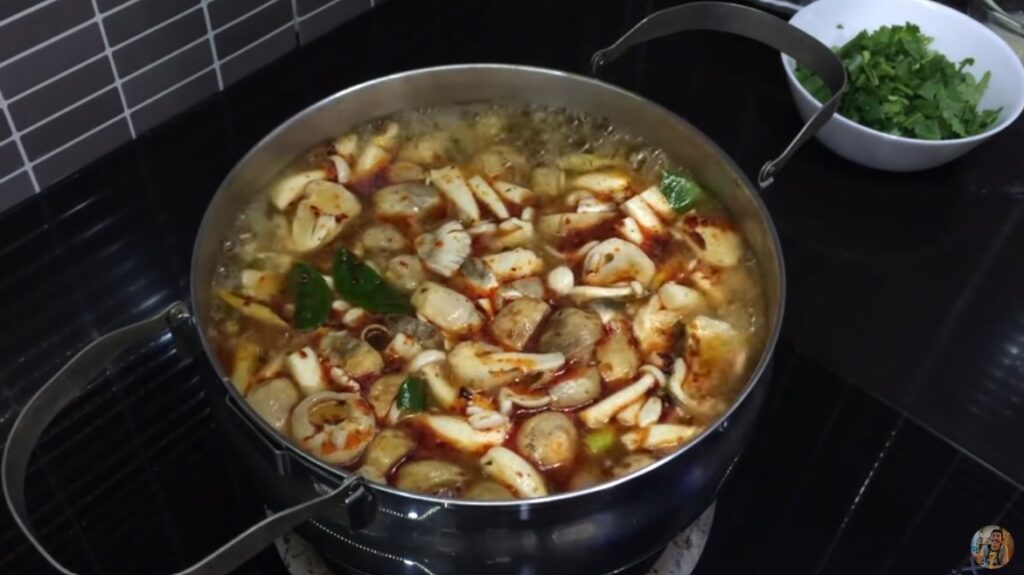 เร่งไฟขึ้นมาให้น้ำเดือดจัด ตามด้วยเครื่องทะเล หอย กุ้ง ปลาหมึก จากนั้นปล่อยไว้ ห้ามคน ไม่อย่างนั้นจะมีกลิ่นคาว