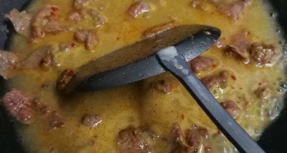 1.เอาหัวกะทิ 2 ทัพพีมาเคี่ยวให้แตกมัน ใช้ไฟปานกลาง ใส่พริกแกงเผ็ด ผัดจนพริกแกงส่งกลิ่นหอม แล้วค่อยๆ เติมกะทิที่เหลือลงไป